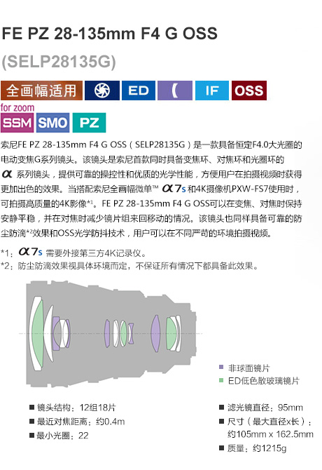 • 商品名称:索尼(SONY) FE PZ 28-135mm F4 G OSS 全画幅电动变焦微单镜头 (SELP28135G)