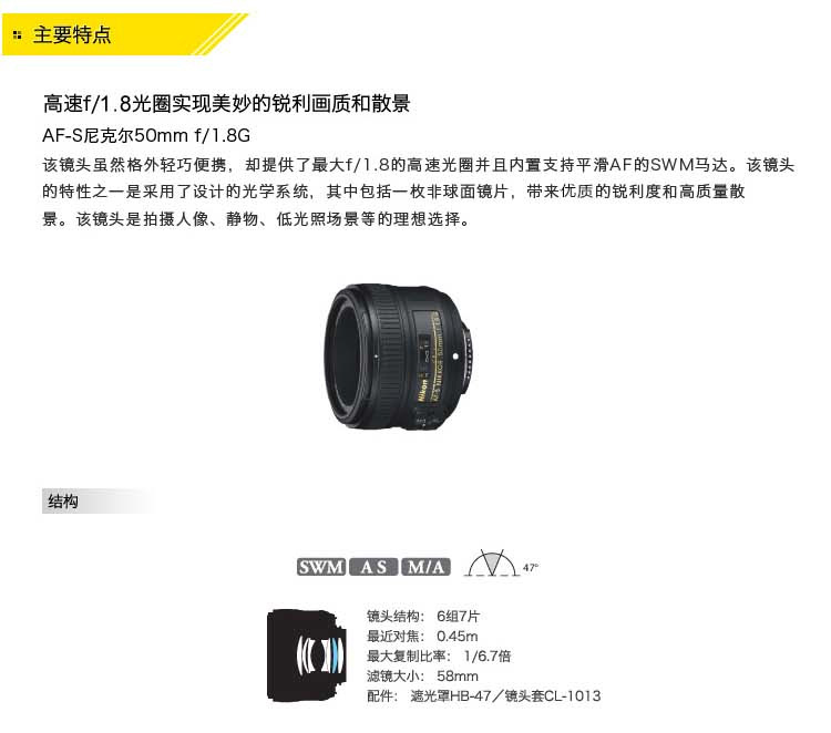 • 商品名称:尼康(Nikon) AF-S 50mm f/1.8G 镜头 (标准-50mm)