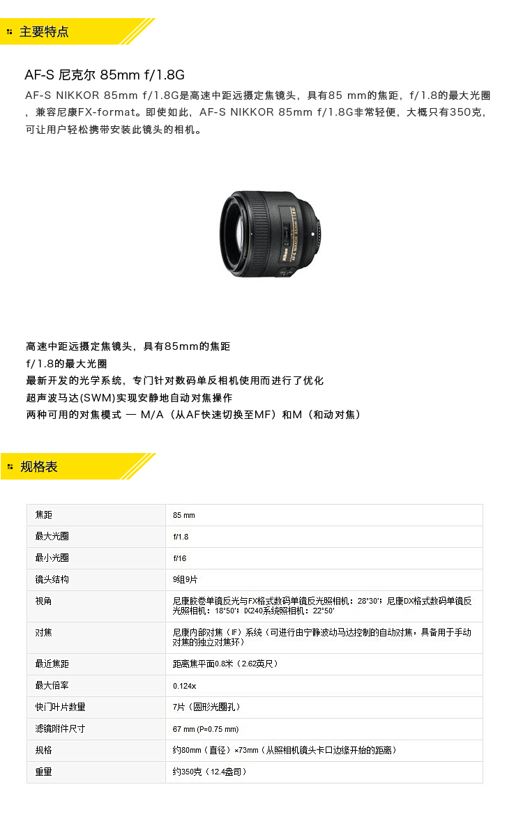 • 商品名称:尼康(Nikon) AF-S 尼克尔 85mm f/1.8G 中远摄定焦镜头 (标准-85mm)