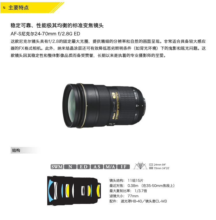• 商品名称:尼康(Nikon) AF-S 24-70mm f/2.8G ED 镜头