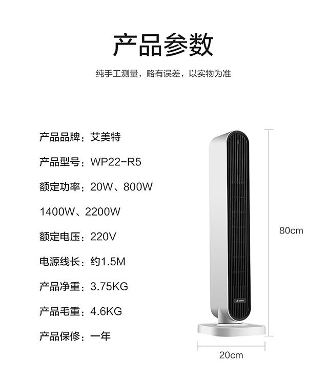 • 商品名称:艾美特(AIRMATE) WP22-R5 取暖器/电暖器/家用电暖气 塔式立式摇头 象牙白时尚速暖暖风机