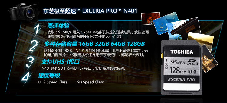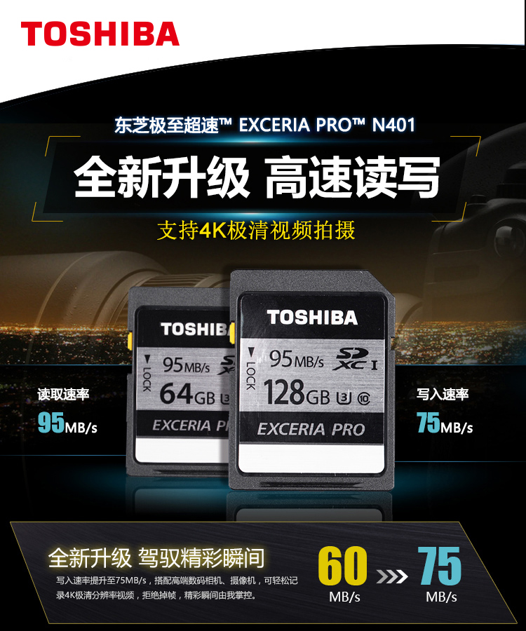 • 商品名称:东芝(TOSHIBA) N401 64GB SD卡 U3 C10 极至超速 读速95MB/s 写速75MB/s 4K高清拍摄 高速稳定存储卡 (SD卡 极速版)