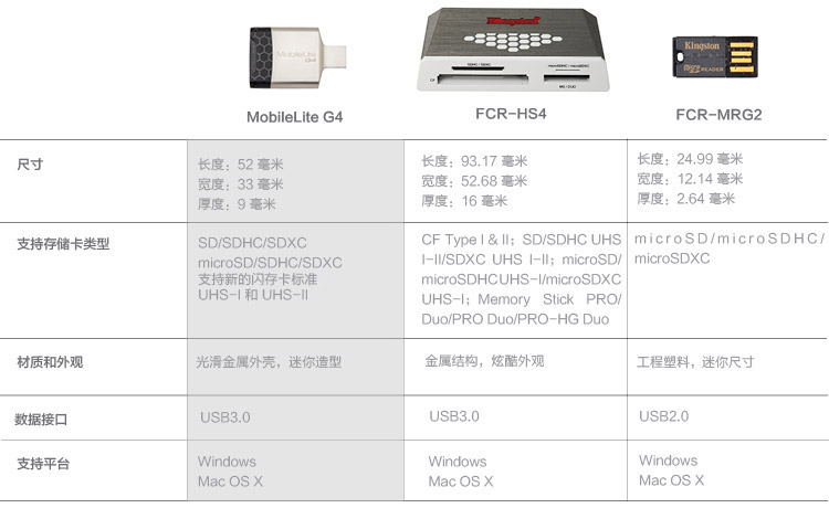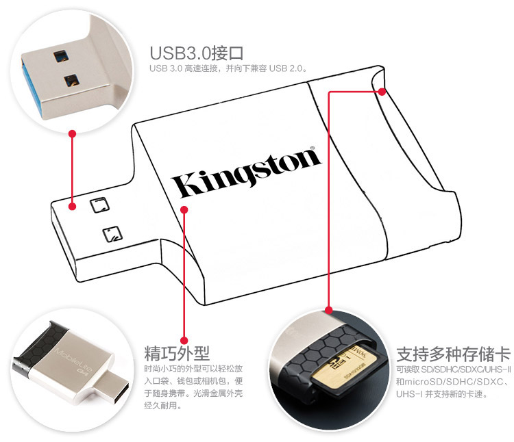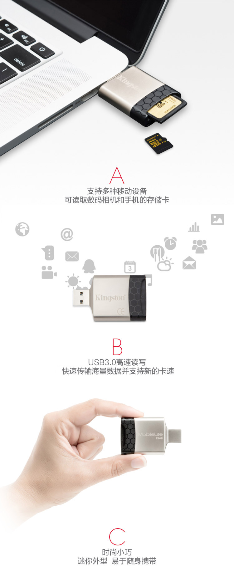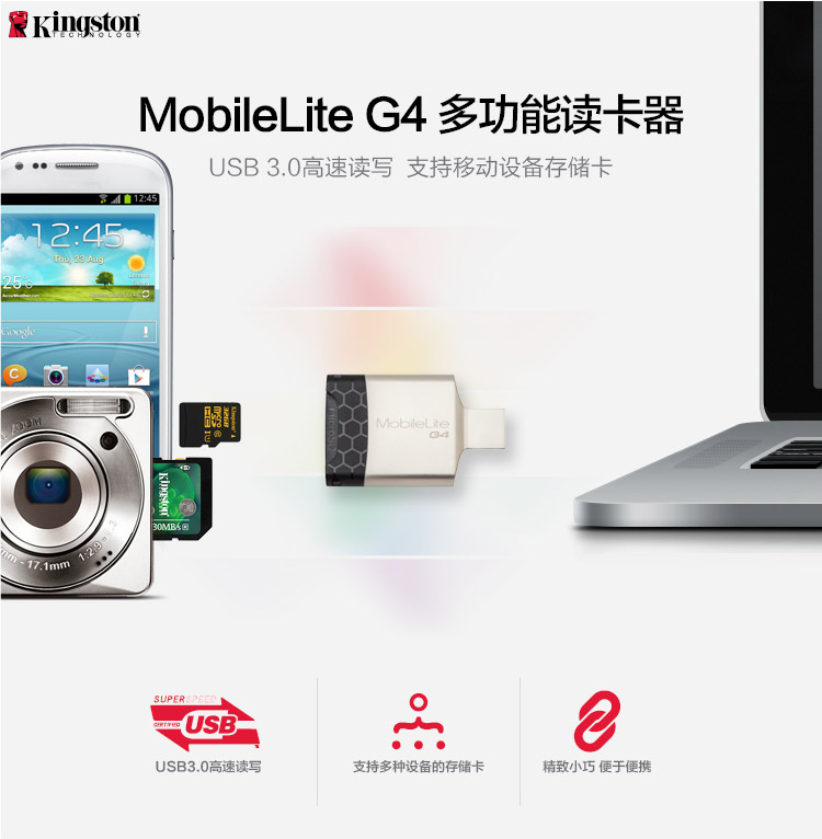 • 商品名称:金士顿(Kingston) FCR-MLG4 多功能读卡器 USB 3.0 MobileLite G4