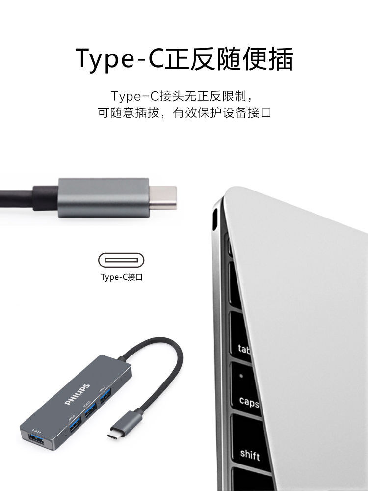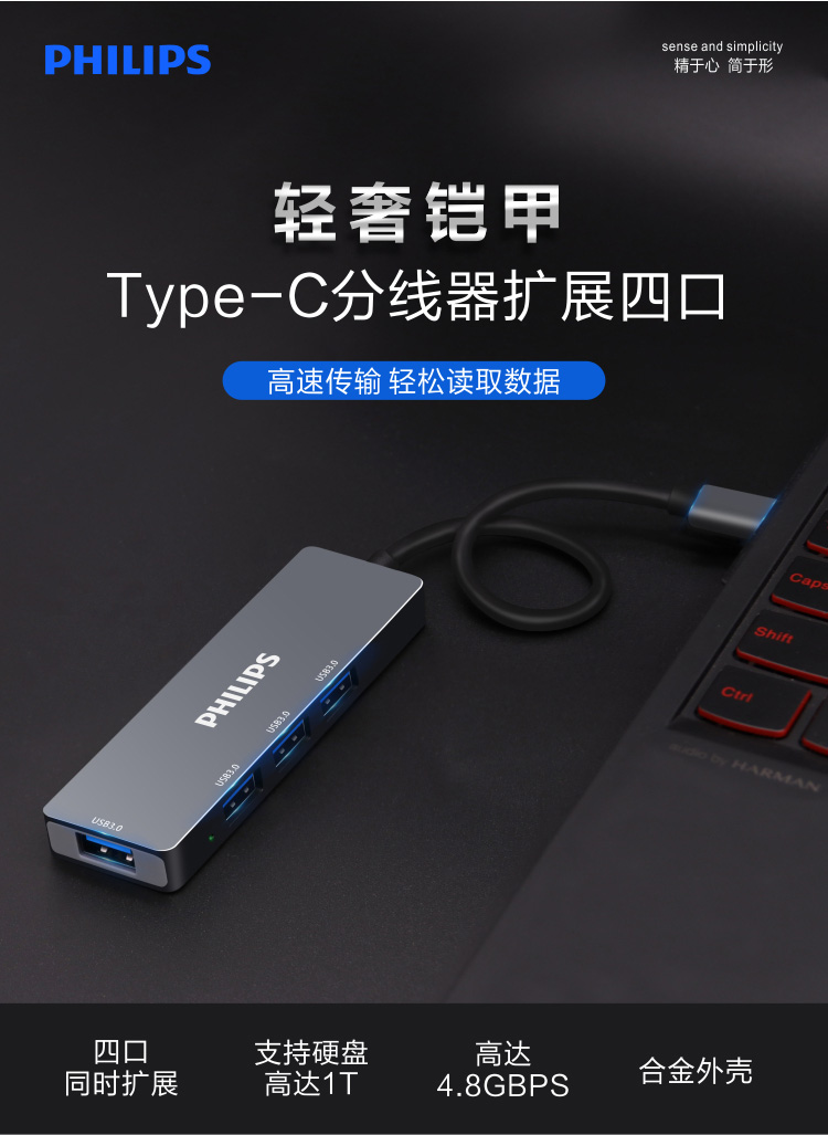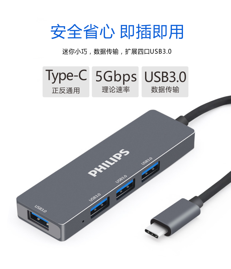飞利浦(PHILIPS) SWR1604S/93 Type-C分线器扩展坞 USB-C转USB3.0多接口 一拖四转换器 四合一