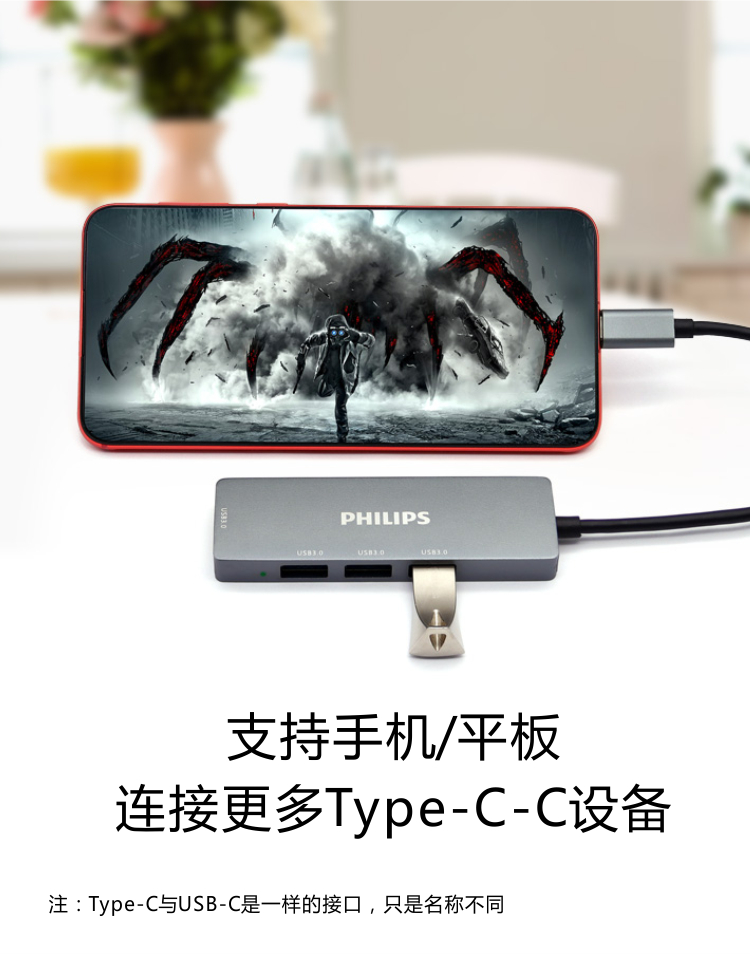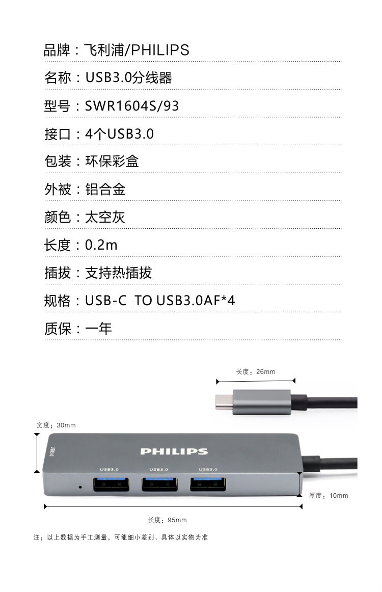 • 商品名称:飞利浦(PHILIPS) SWR1604S/93 Type-C分线器扩展坞 USB-C转USB3.0多接口 一拖四转换器 四合一