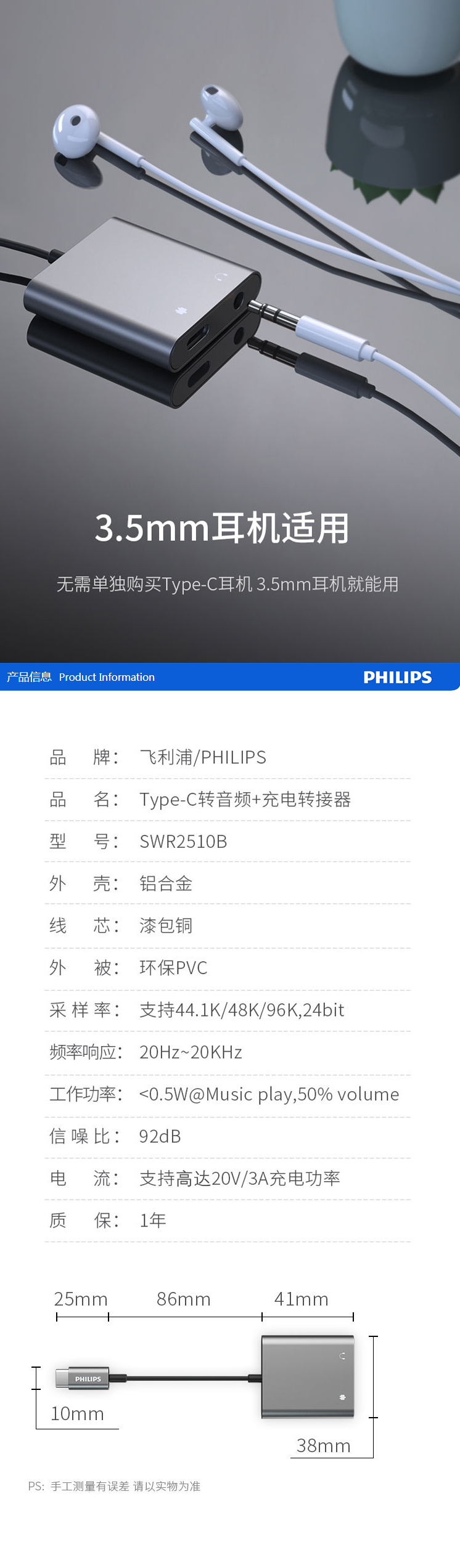 • 商品名称:飞利浦(PHILIPS) SWR1504J/93 TYPE-C转3.5mm音频带充电口安卓手机USB-C转接头