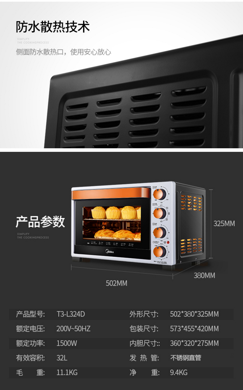• 商品名称:美的(Midea) T3-L324D 多功能电烤箱 上下独立控温 搪瓷易清洁内胆 双层隔热门 32L