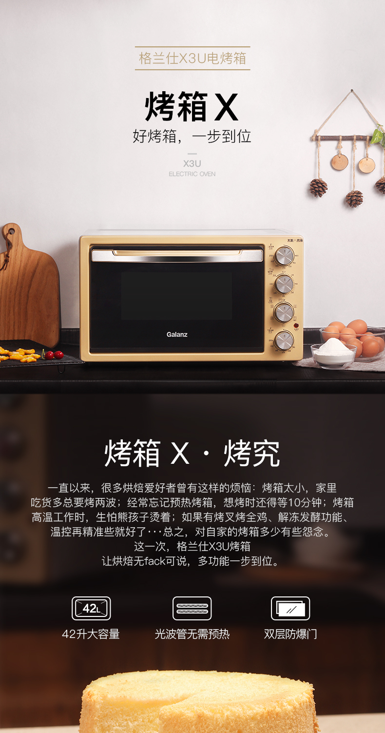 • 商品名称:格兰仕(Galanz) X3U 烘焙烤箱光波免预热型 多功能家用电烤箱 42L