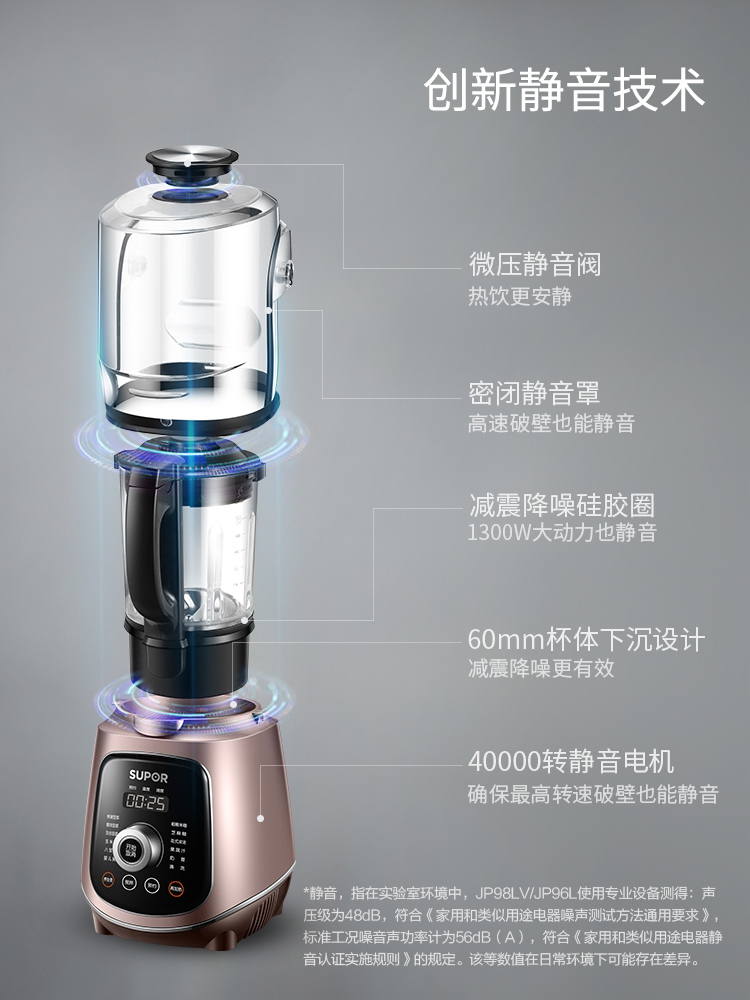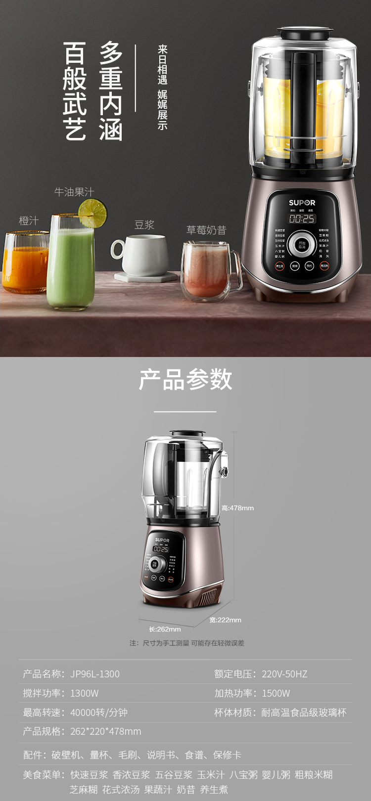 • 商品名称:苏泊尔(SUPOR) JP96L-1300 破壁机 创新静音技术 静音1500W球釜加热智能预约榨汁机豆浆机辅食机绞肉机