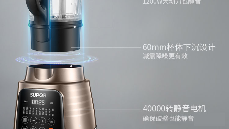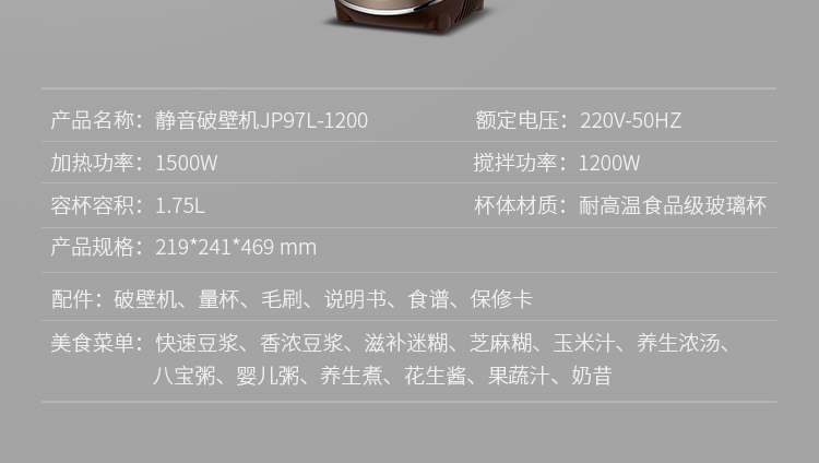 • 商品名称:苏泊尔(SUPOR) JP97L-1200 破壁机静音多功能加热全自动料理机豆浆机 免洗1.75L 冷热双杯 干磨杯