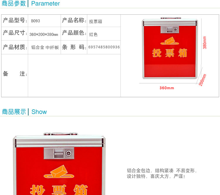 • 商品名称:金隆兴(Glosen) B093 铝合金投票箱 中号高档铝制票箱/选票箱/选举箱 红色