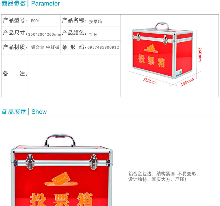 • 商品名称:金隆兴(Glosen) B091 铝合金投票箱 小号高档铝制票箱/选票箱/集票箱/选举箱 红色