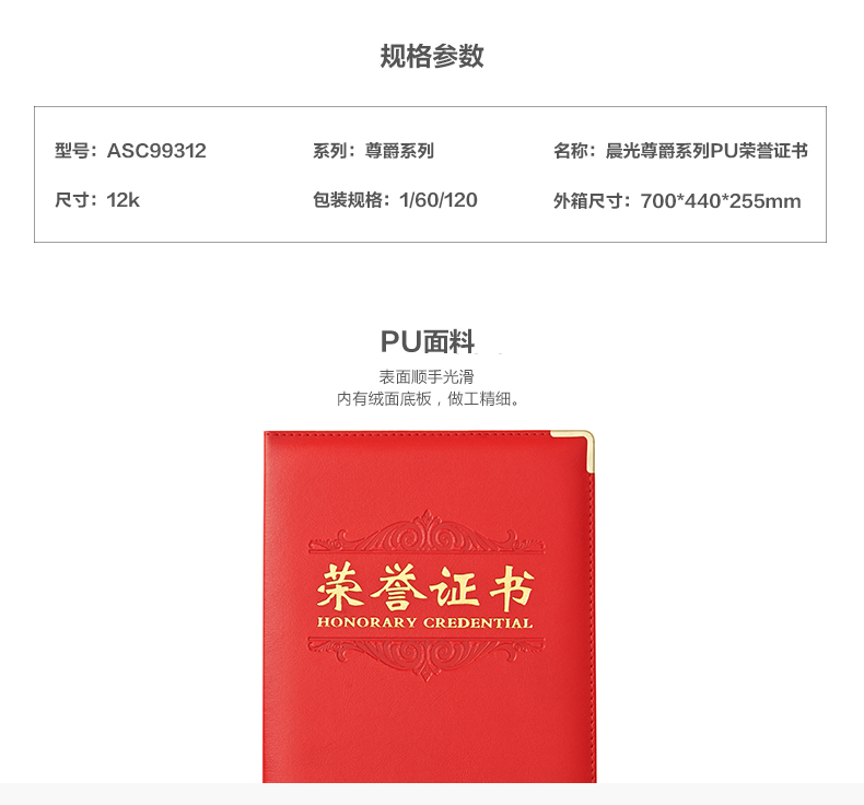 • 商品名称:晨光(M&G) ASC99312 尊爵PU荣誉证书12K 含芯 228mm*155mm 内芯型号:ASC99327