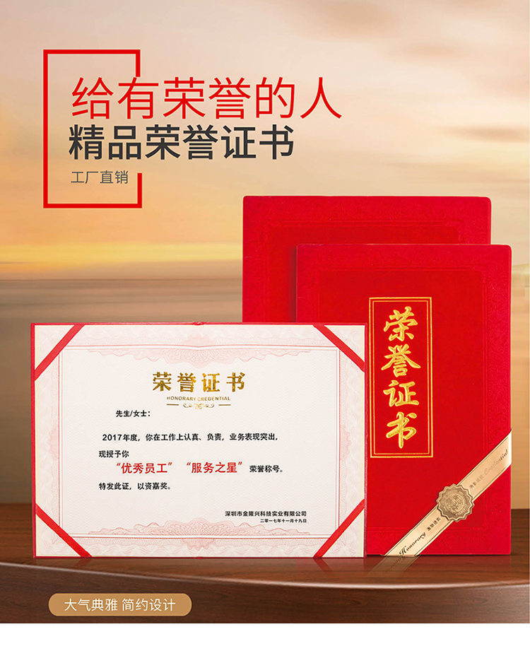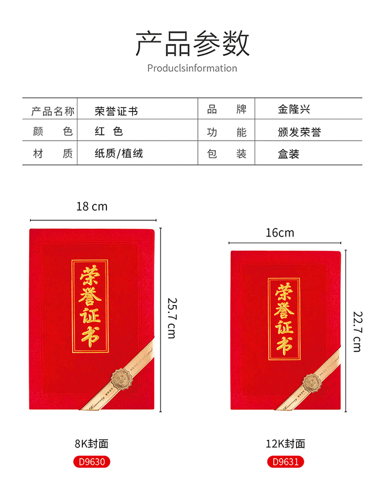 • 商品名称:金隆兴(Glosen) D9630 8K荣誉证书 加厚绒面奖状附赠内芯颁奖证书 10本/箱