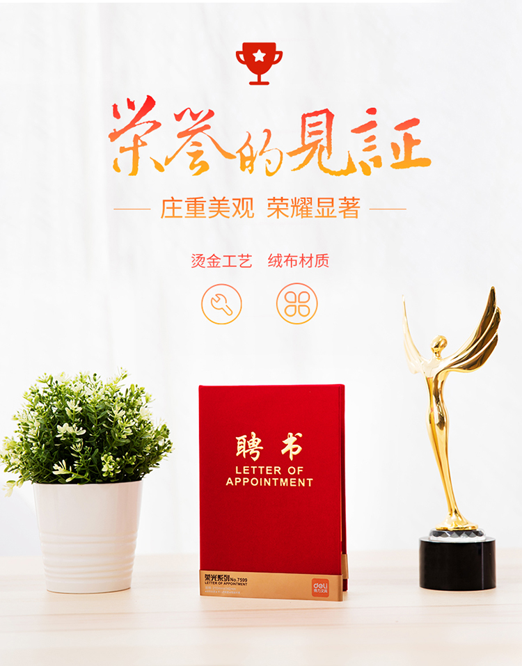• 商品名称:得力(deli)7599 荣光系列绒布浮雕工艺聘书 12K 红色