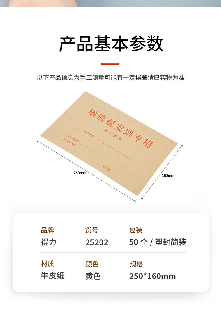 • 商品名称:得力(deli) 25202 信封 增值税发票收纳专用 加厚牛皮纸信封票据袋子 50张