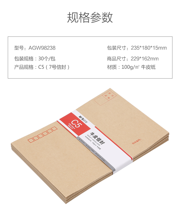 • 商品名称:晨光(M&G) AGW98238 7号牛皮纸信封 229*162mm发票袋 邮局标准信封袋工资袋 30个装