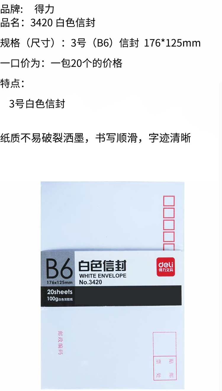 • 商品名称:得力(deli) 3420 3号白色信封 邮局标准信封176*125mm 20张