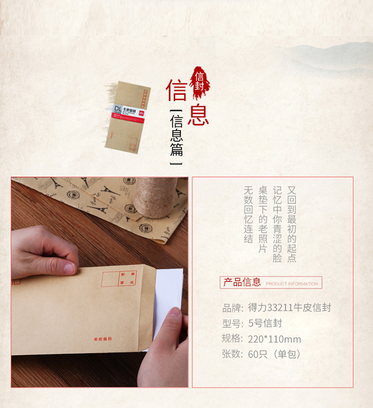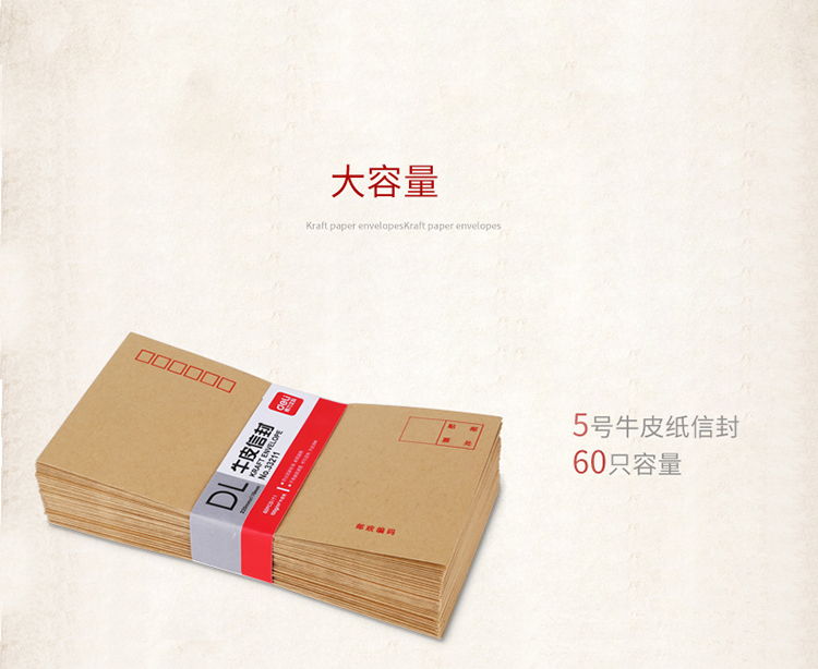 • 商品名称:得力(deli)33211 5号牛皮邮局标准信封 220*110mm 60张/包