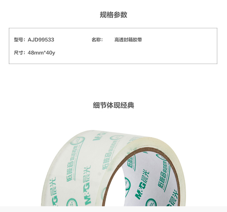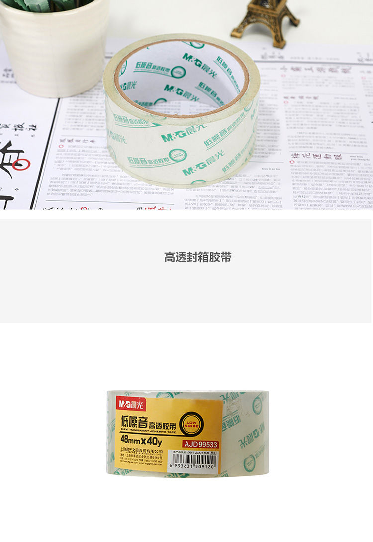 • 商品名称:晨光(M&G)AJD99533 低噪单髙透封箱胶带 透明胶带48mm*40y