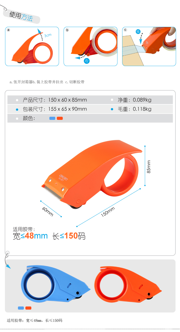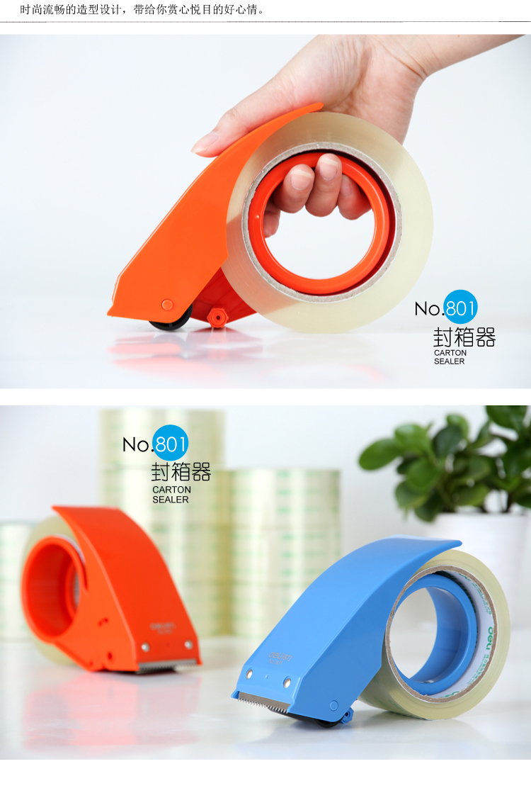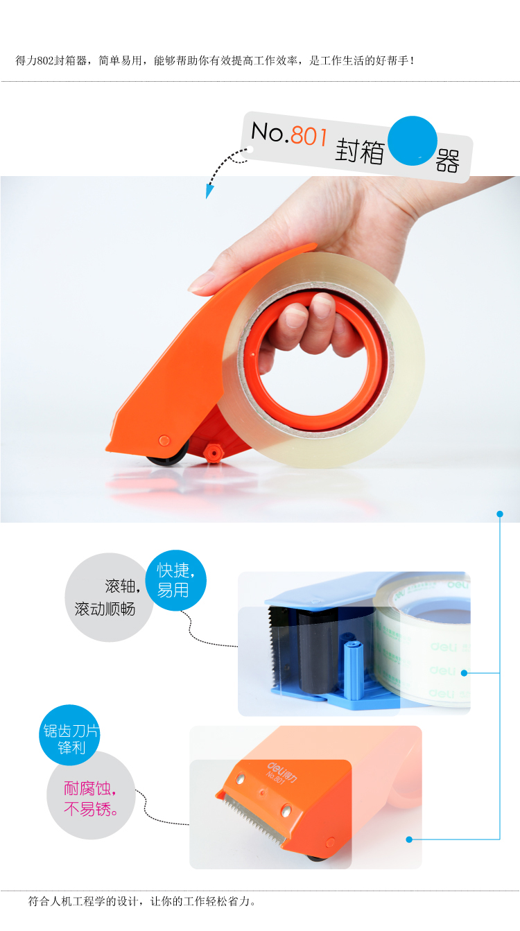 • 商品名称:得力(deli)801 封箱器/打包器/胶带底座/胶带切割器 适用胶带宽度48mm 不锈钢刀口 颜色随机