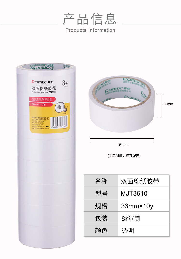 • 商品名称:齐心(COMIX) MJT3610 高粘性棉纸双面胶带 36mm*10y 8卷装 白