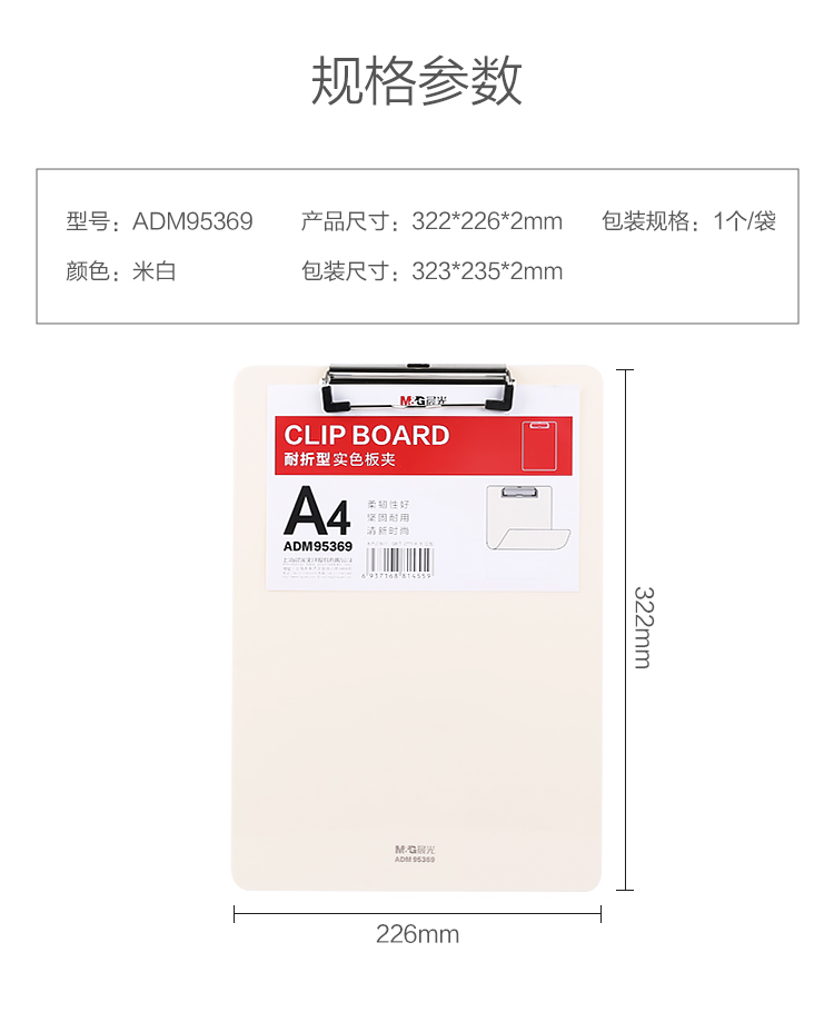 • 商品名称:晨光(M&G)ADM95369 耐折型A4板夹 书写垫板米白色