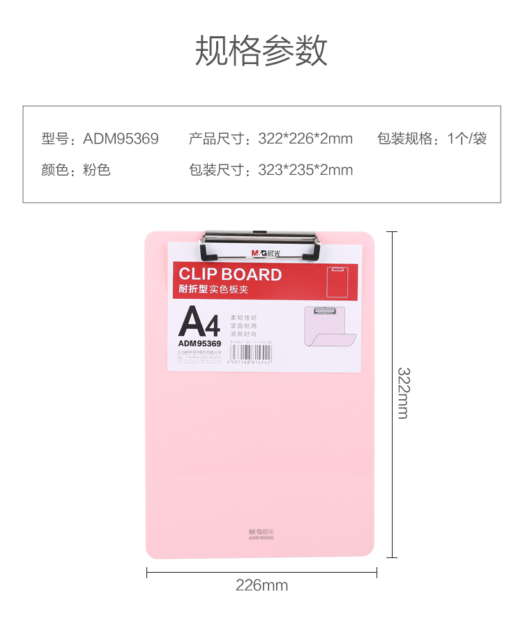 • 商品名称:晨光(M&G)ADM95369 耐折型A4板夹 书写垫板粉色