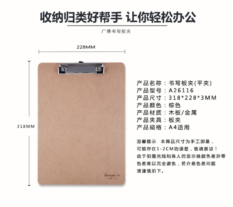 • 商品名称:广博(GuangBo)A26116 A4平夹型木质书写板夹/文件夹板/办公用品