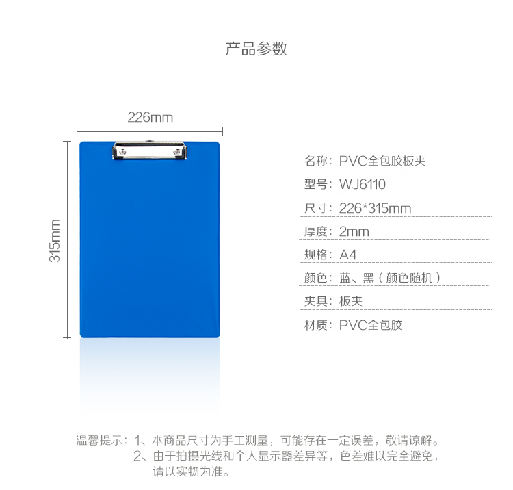 • 商品名称:广博(GuangBo)WJ6110 PVC全包胶A4书写垫板/文件夹板/办公用品 随机