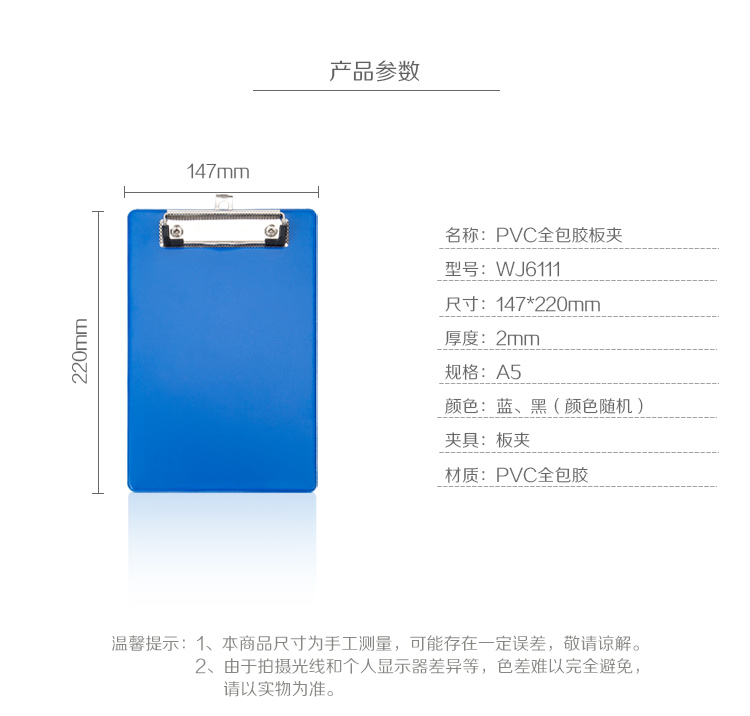 • 商品名称:广博(GuangBo)WJ6111 PVC全包胶A5书写板夹/文件夹板/办公用品 随机