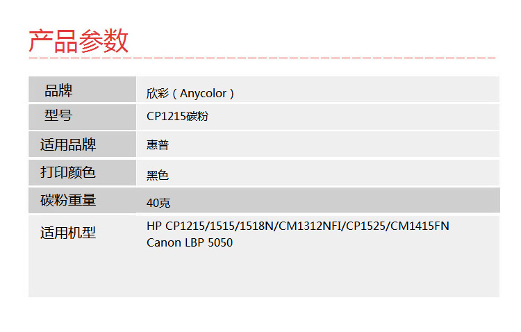 • 商品名称:欣彩(Anycolor)AT-1215K 黑色碳粉40g 适用惠普HP CP1215 1515 1518N CP1525粉盒