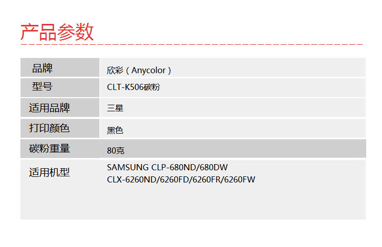 • 商品名称:欣彩(Anycolor)AT-K506 黑色碳粉墨粉80g 适用三星CLP-680ND 680DW CLX-6260ND 6260FD