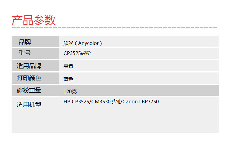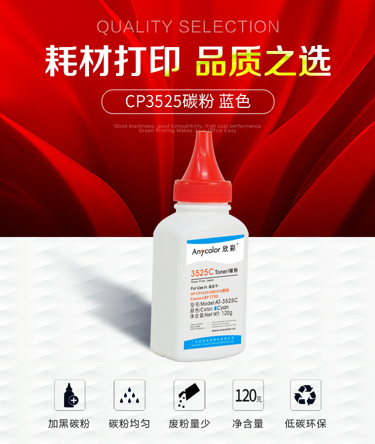 • 商品名称:欣彩(Anycolor)AT-3525C 蓝色碳粉墨粉120g 适用惠普HP CP3525 CM3530 Canon LBP7750