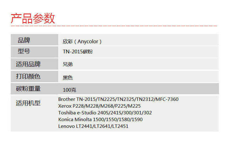 • 商品名称:欣彩(Anycolor) AT-2015 碳粉墨粉100g 适用兄弟TN1035 2015 3335 联想LT2441 2661 2451