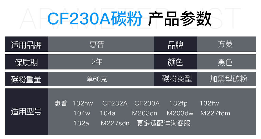 • 商品名称:方菱(FangLing) CF230A 粉盒 碳粉适用于惠普M203dn M203dw M227fdn 单支装