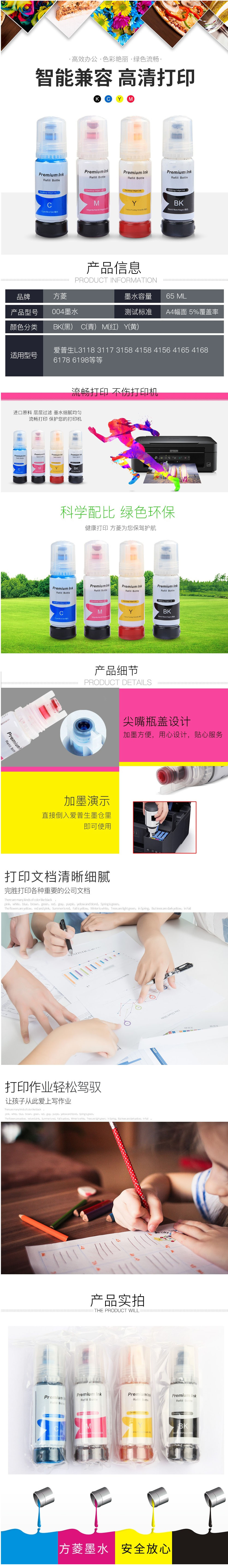 • 商品名称:方菱(FangLing) 004 蓝色打印机墨水 适用爱普生EPSON L3108 3118 3119 3158墨仓式打印机 (004墨水蓝色)