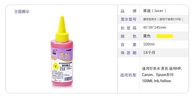 • 商品名称:莱盛(laser) 通用型墨水 黄色(通用惠普、佳能、爱普生喷墨打印机)