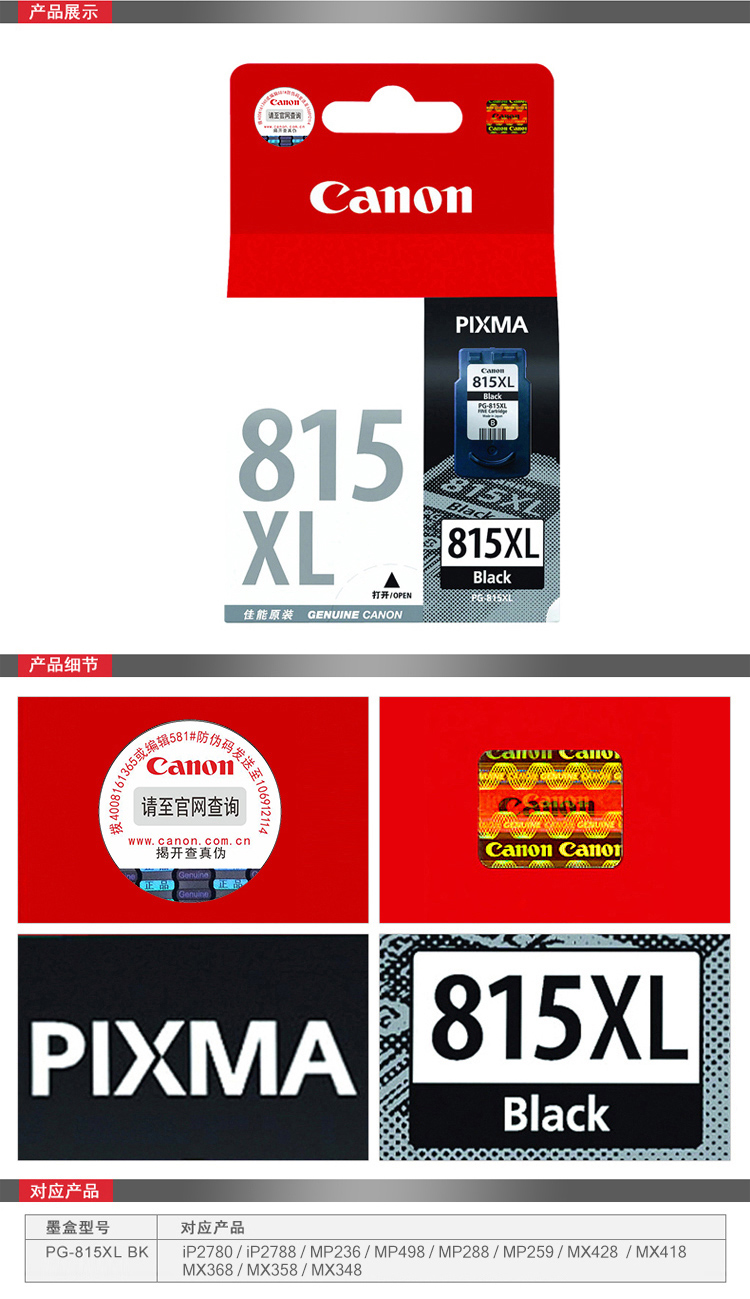 • 商品名称:佳能(Canon)PG-815XL 黑色大容量墨盒(适用iP2780、iP2788、MP236、MP288)