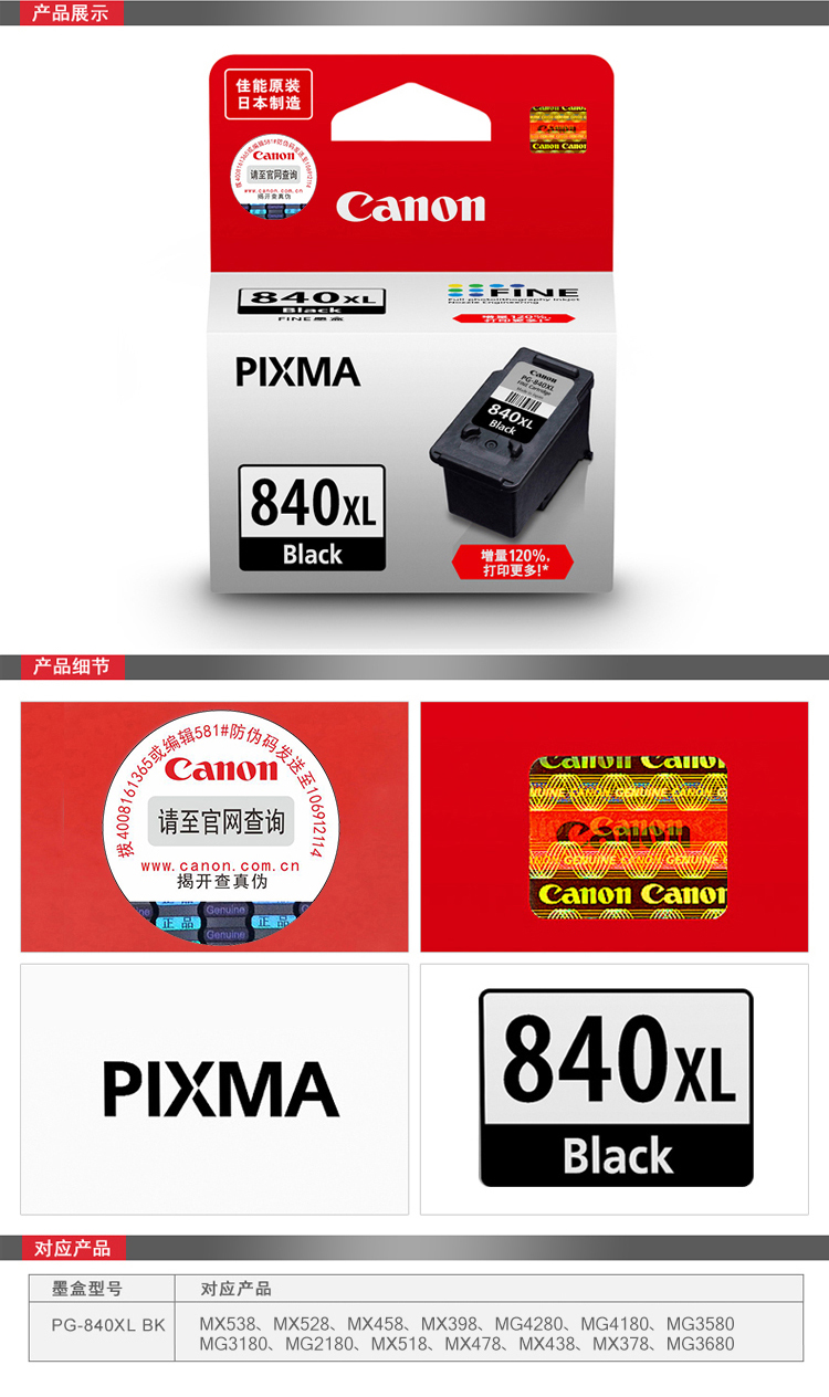 • 商品名称:佳能(Canon)PG-840XL 高容黑色墨盒(适用MX538、MX458、MX478、MG3680)