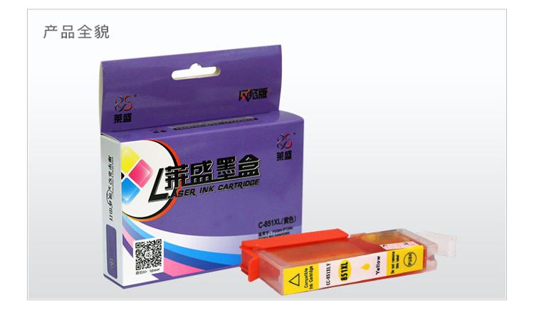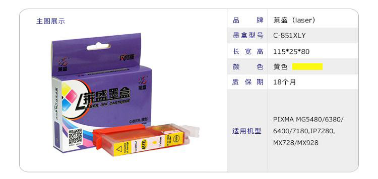 • 商品名称:莱盛(laser) C-851XLY 高容黄色墨盒(适用于佳能PIXMA MG5480/6380/6400/7180/IP7280/MX728/MX928)