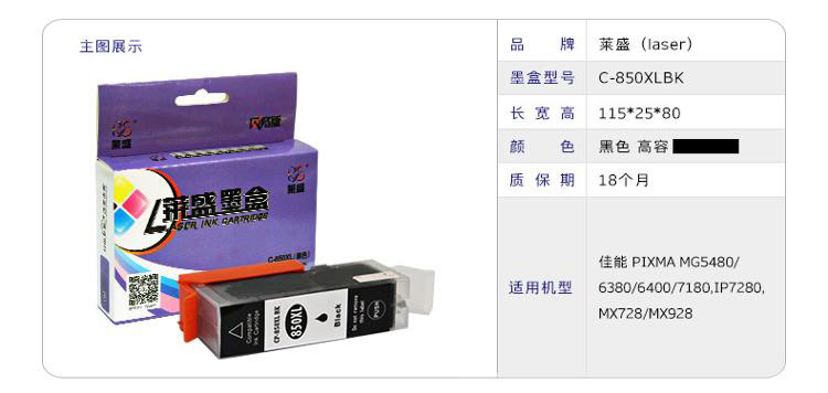 • 商品名称:莱盛(laser) C-850XL 黑色高容墨盒(适用于 佳能 PIXMA MG5480/6380/6400/7180,IP7280,MX728/MX928)