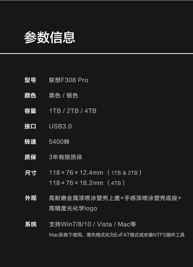 • 商品名称:联想(Lenovo) F308 Pro 2TB USB3.0 移动硬盘 2.5英寸 暮辰黑 稳定耐用 轻松备份 高速传输