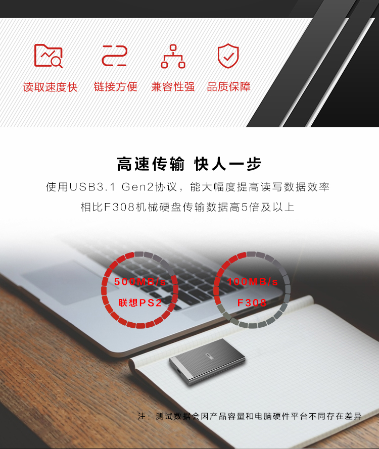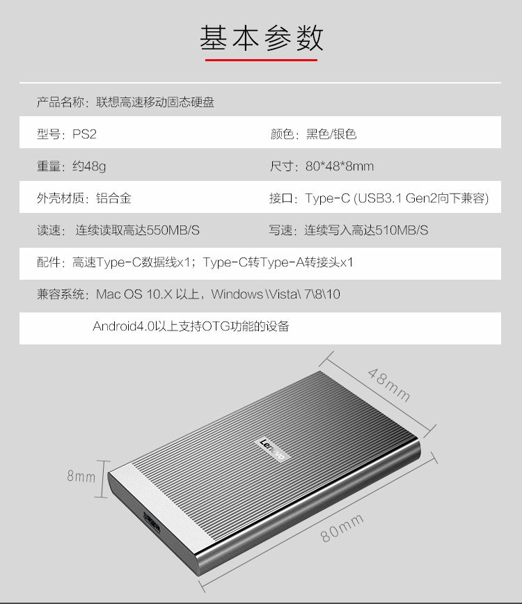 • 商品名称:联想(Lenovo) PS2 500GB固态 Type-C USB3.1 移动硬盘(PSSD) 读速高达550MB/s 皓月银