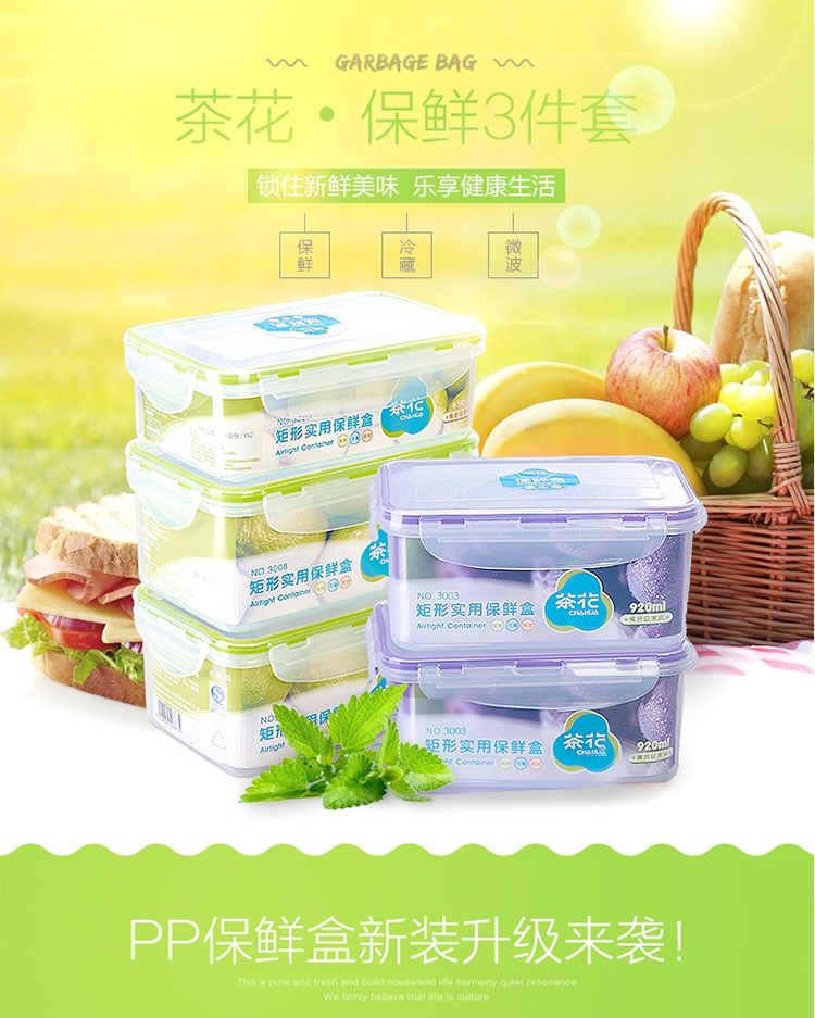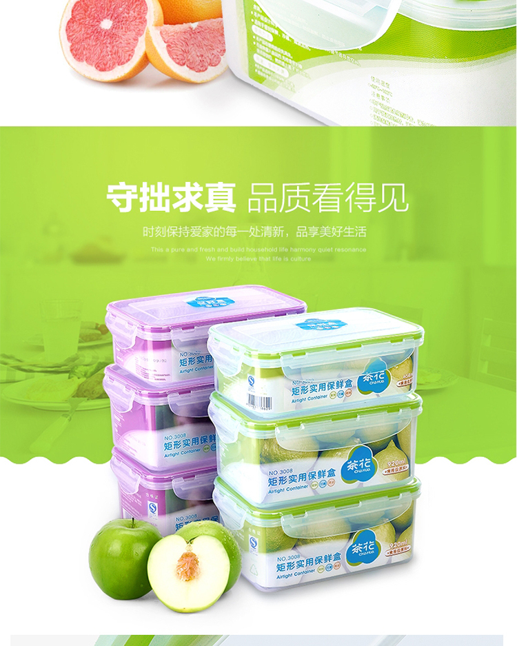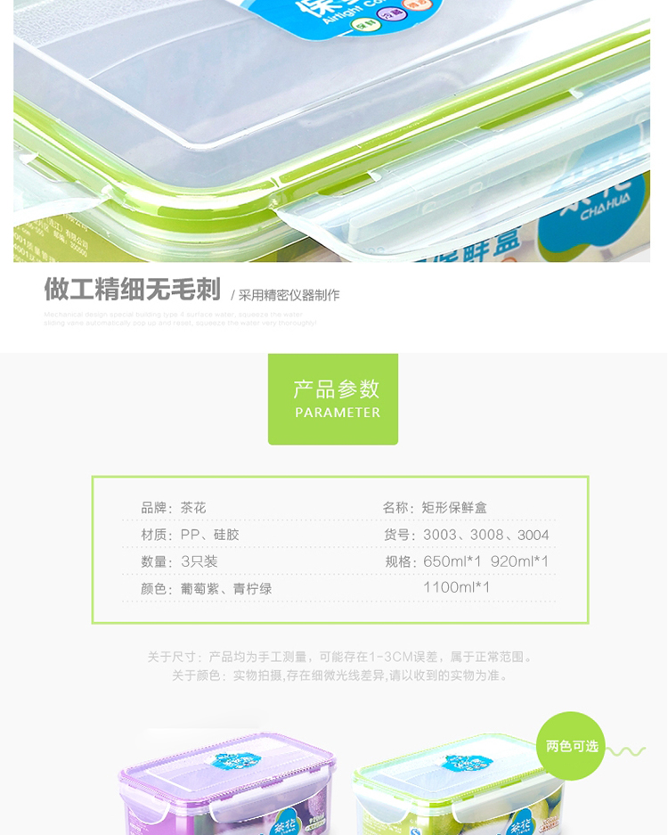• 商品名称:茶花(CHAHUA) 3003+3008+3004 保鲜盒塑料饭盒长方形微波便当水果盒 650ML+920ML+1100ML 三件套 青柠绿