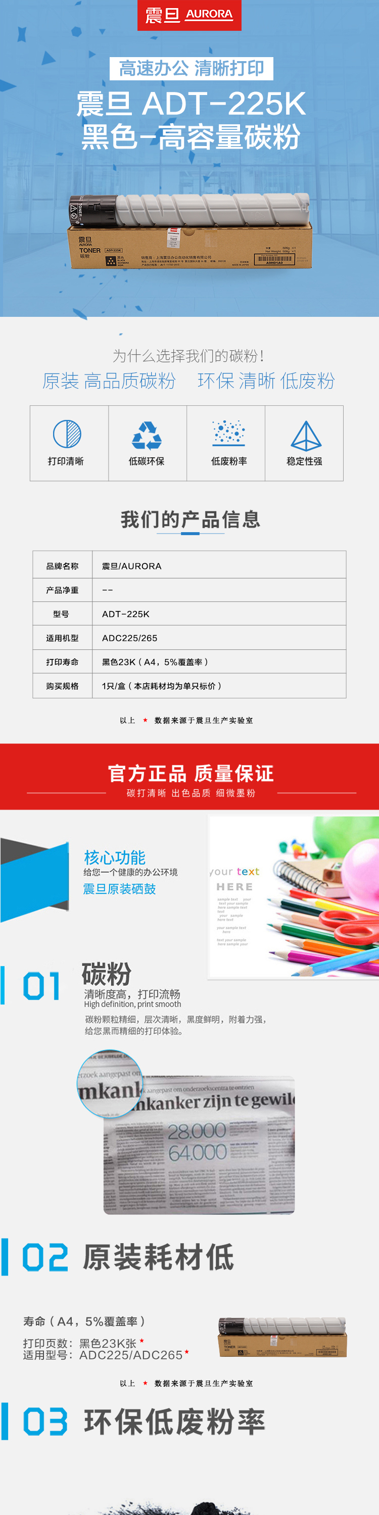 • 商品名称:震旦(AURORA)ADT-225K 黑色-高容量碳粉(适用ADC225/265系列机型)约23000页