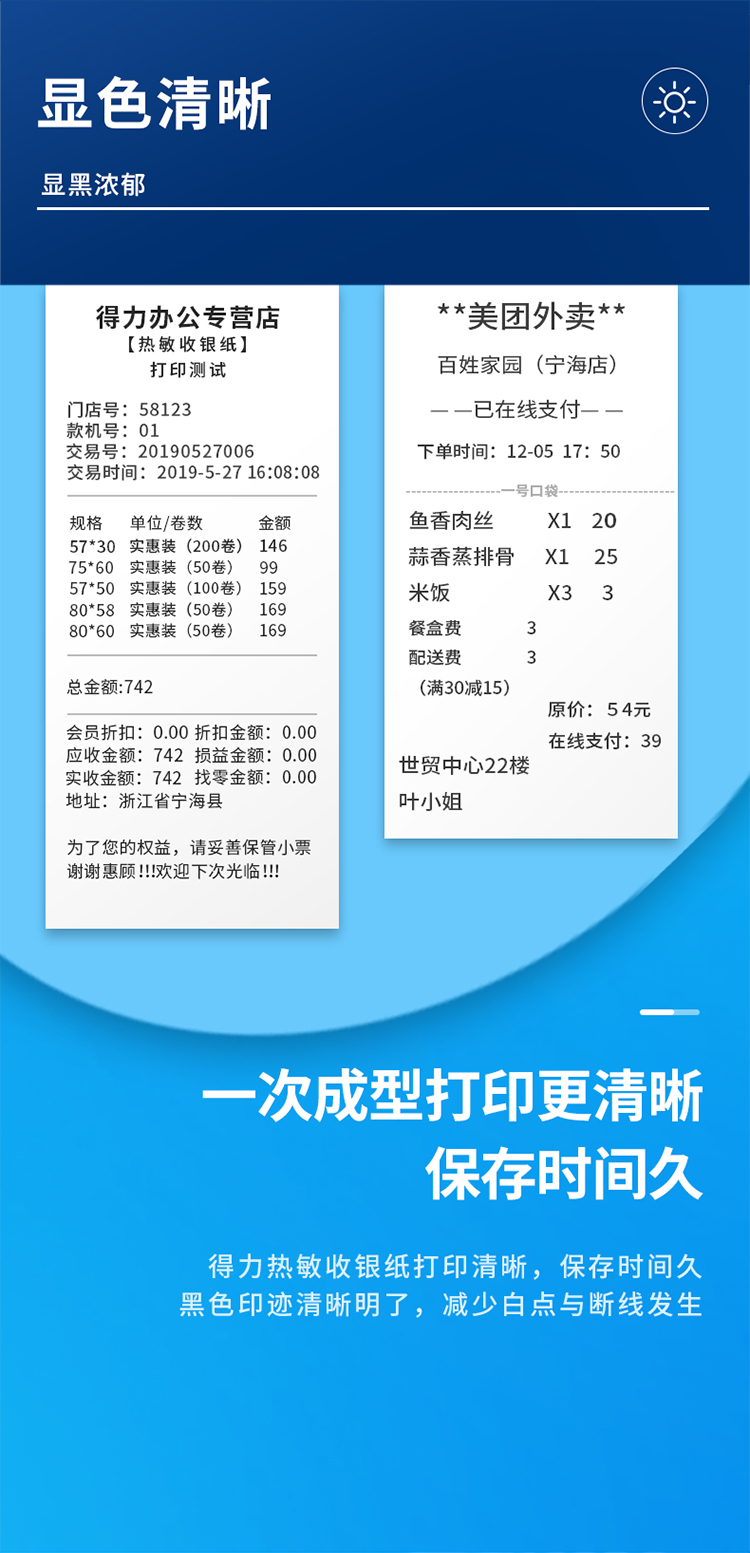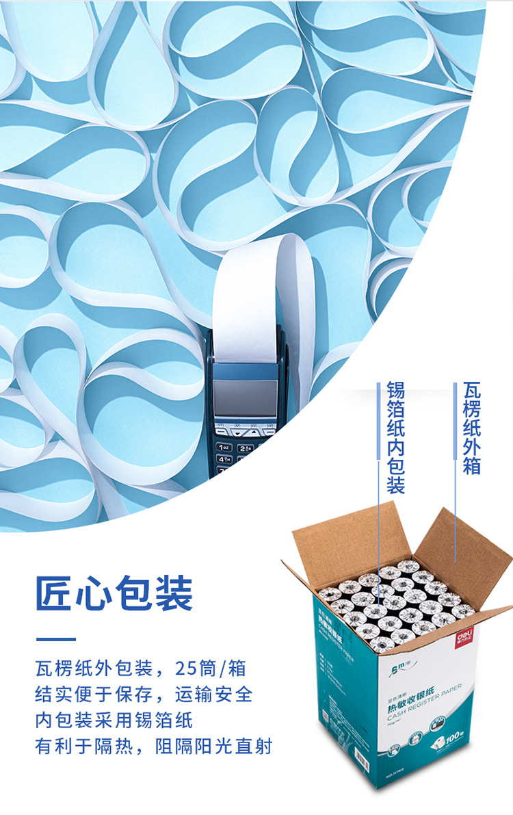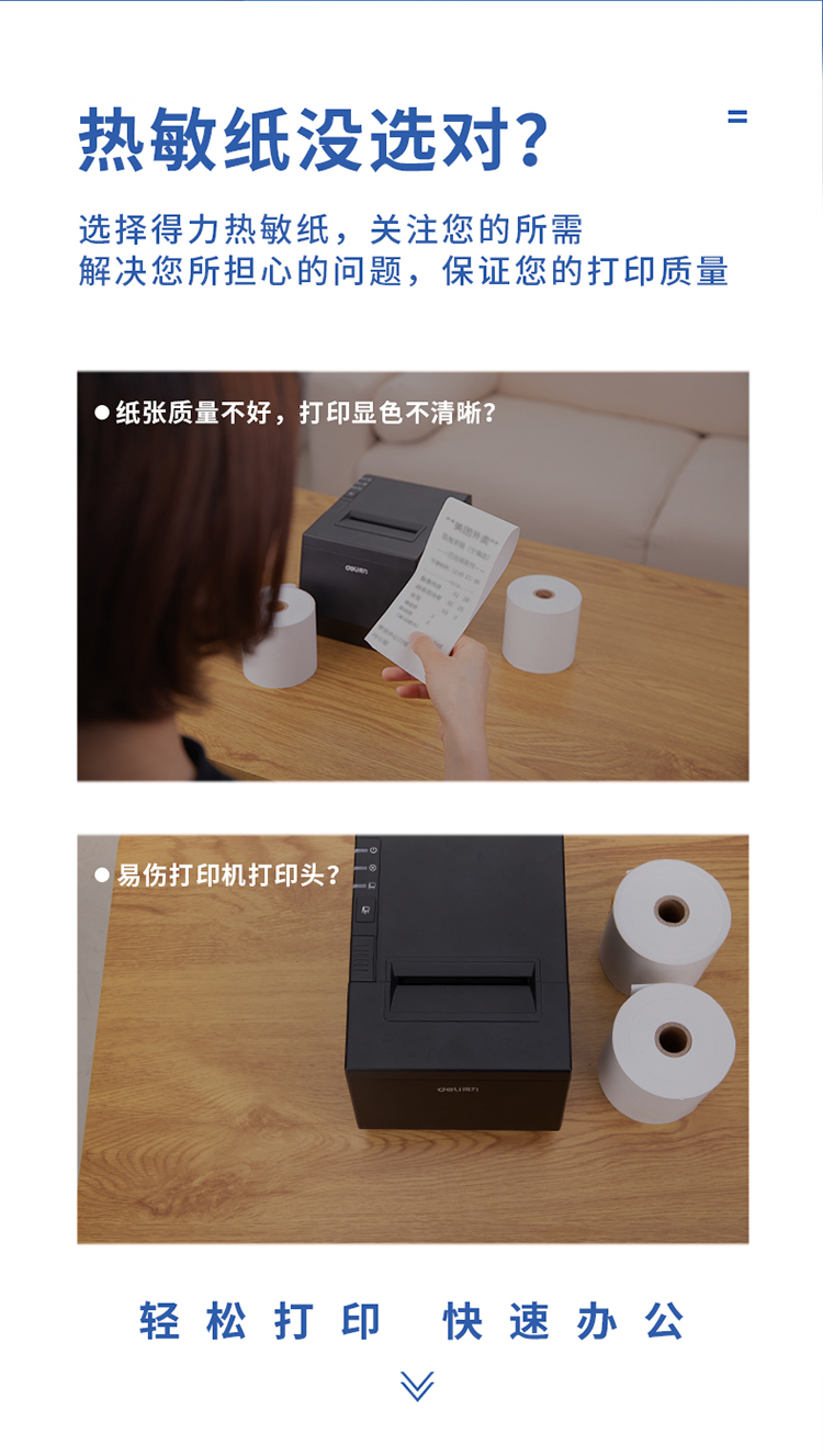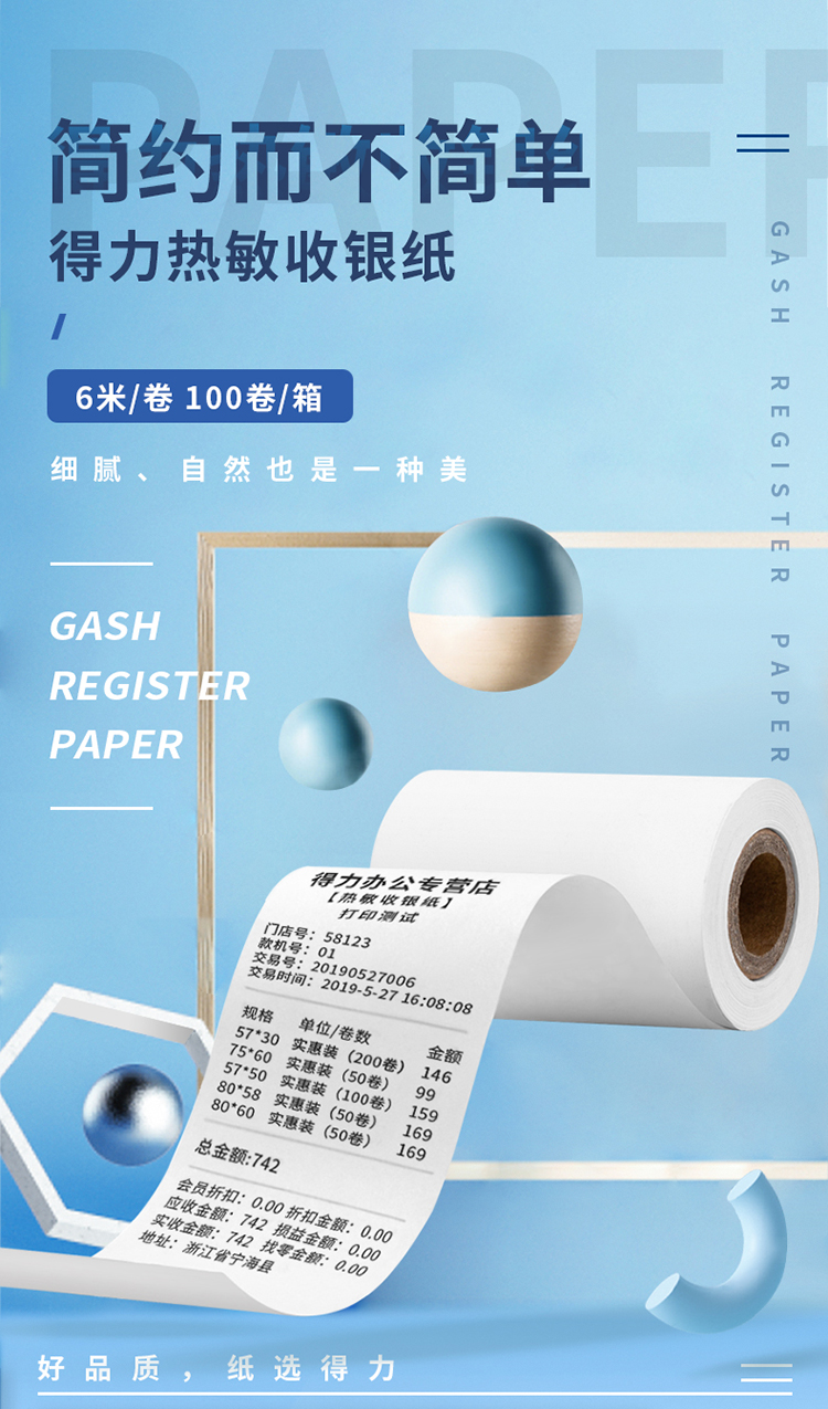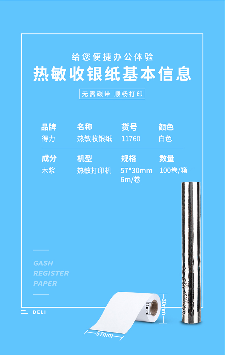 • 商品名称:得力(deli) 11760 热敏收银纸57*30mm 超市外卖小票纸排队叫号纸 6米/卷 100卷