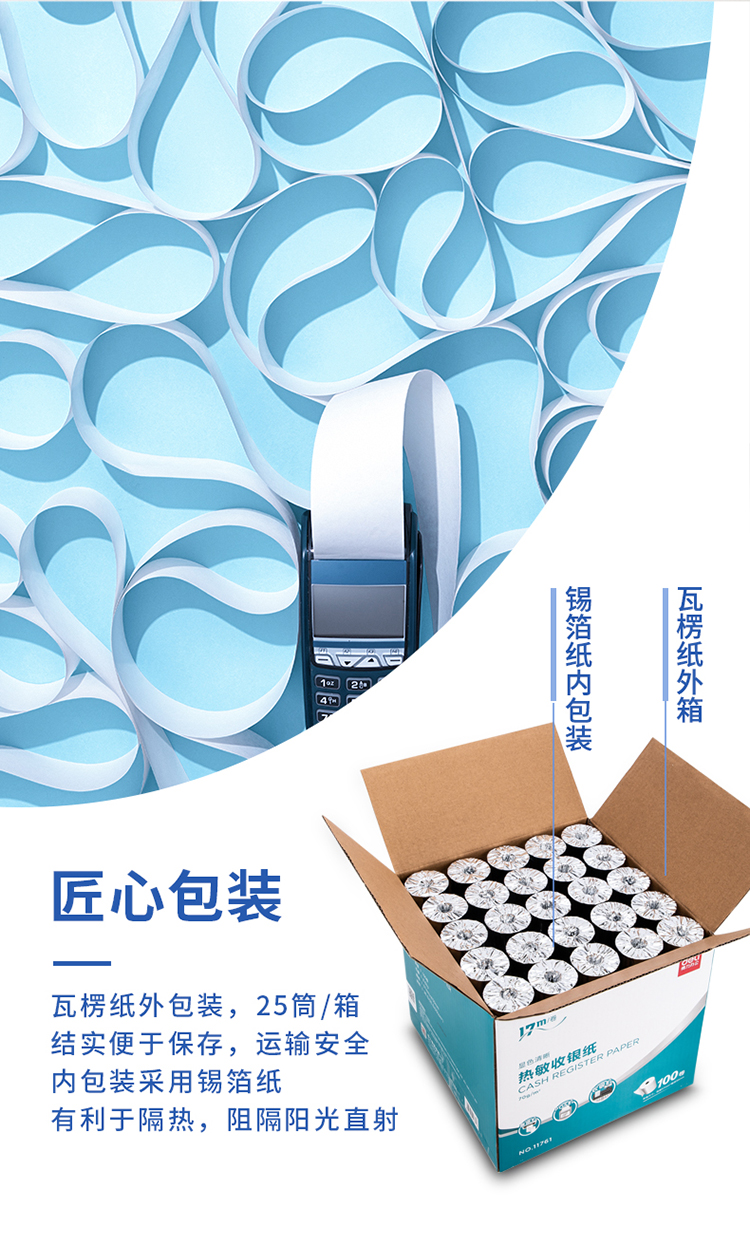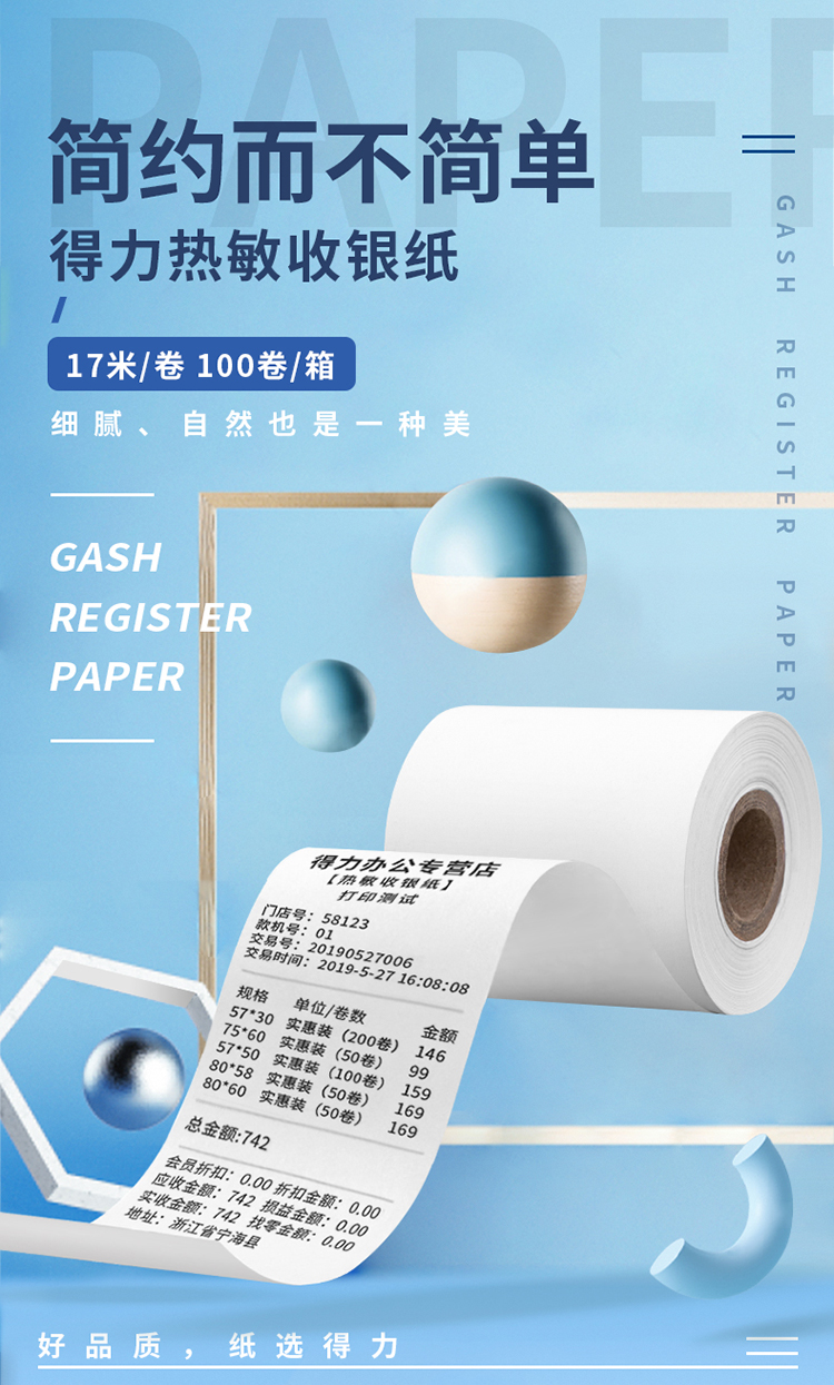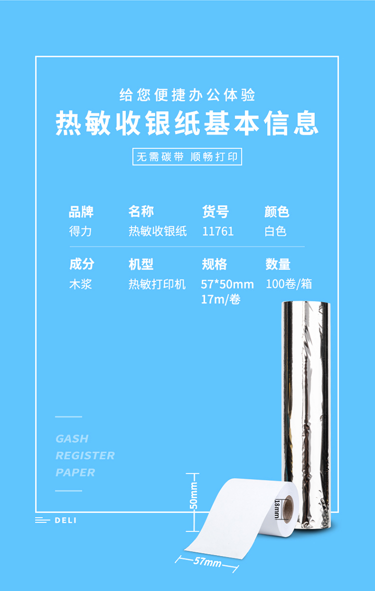 • 商品名称:得力(deli) 11761 热敏收银纸57*50mm 超市外卖小票纸/刷卡机餐饮排队叫号纸 17米/卷 100卷
