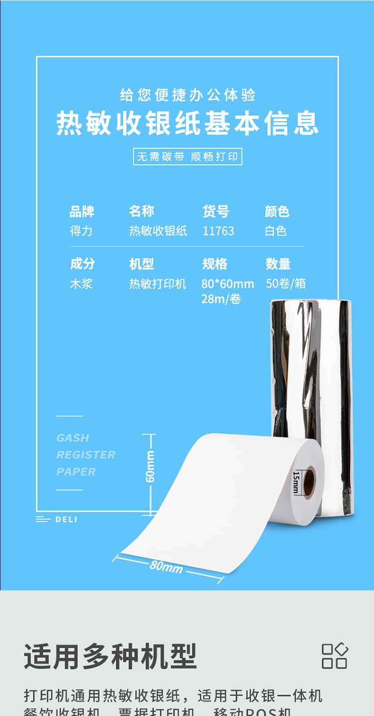 • 商品名称:得力(deli) 11763 热敏收银纸80*60mm/超市外卖小票纸/刷卡机餐饮排队叫号纸 28米/卷 50卷