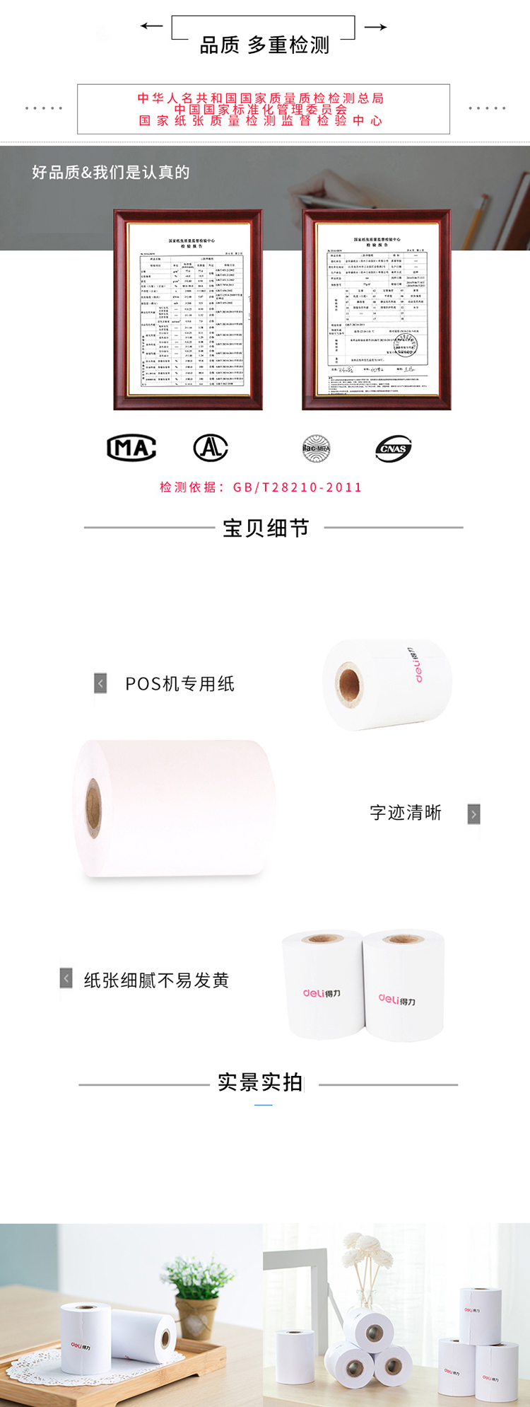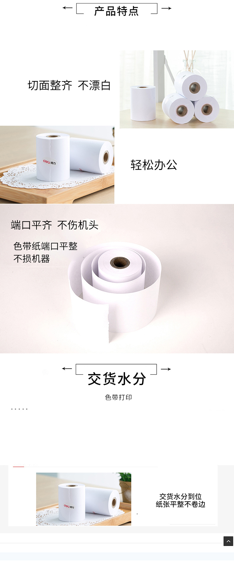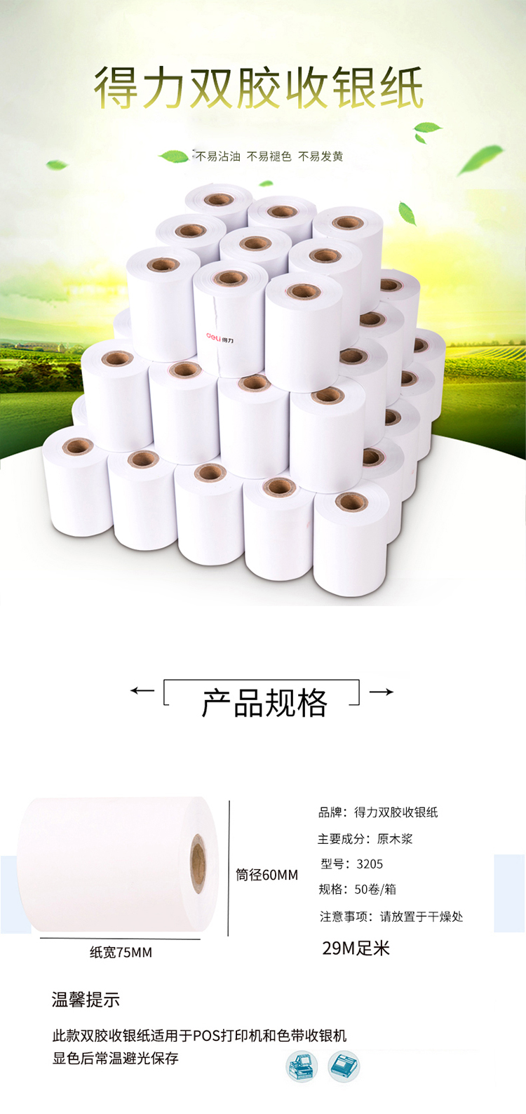• 商品名称:得力(deli)3205 双胶收银纸75mm*60mm/收银机打印纸/超市小票打印纸 30米/卷 50卷/箱